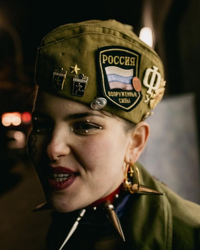 Bild von Maria van der Velde/Nazareth, gepostet am 27.01.2025, das Outfit mit Symboliken des russischen Militärs wurde zu einer Vernissage in Berlin getragen, zu der Unsafe House eine Arbeit beigetragen hatte. Die Ausstellung fand im Dezember 2024 statt. Auf der Kopfbedeckung von Van der Velde ist zudem das russische Wappen als großer goldener Anstecken zu sehen. Auf anderen Bilder auf Social Media ist speziell diese Mütze wenig bis gar nicht zu sehen.